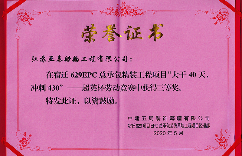 近日,我司喜获宿迁629项目“超英杯”劳动竞赛三等奖,总包方中建五局装饰幕墙有限公司领导向我司颁发了荣誉证书和奖金壹万元,用于表彰我司在“大干40天,冲刺430” “超英杯”劳动竞赛中所作的努力。